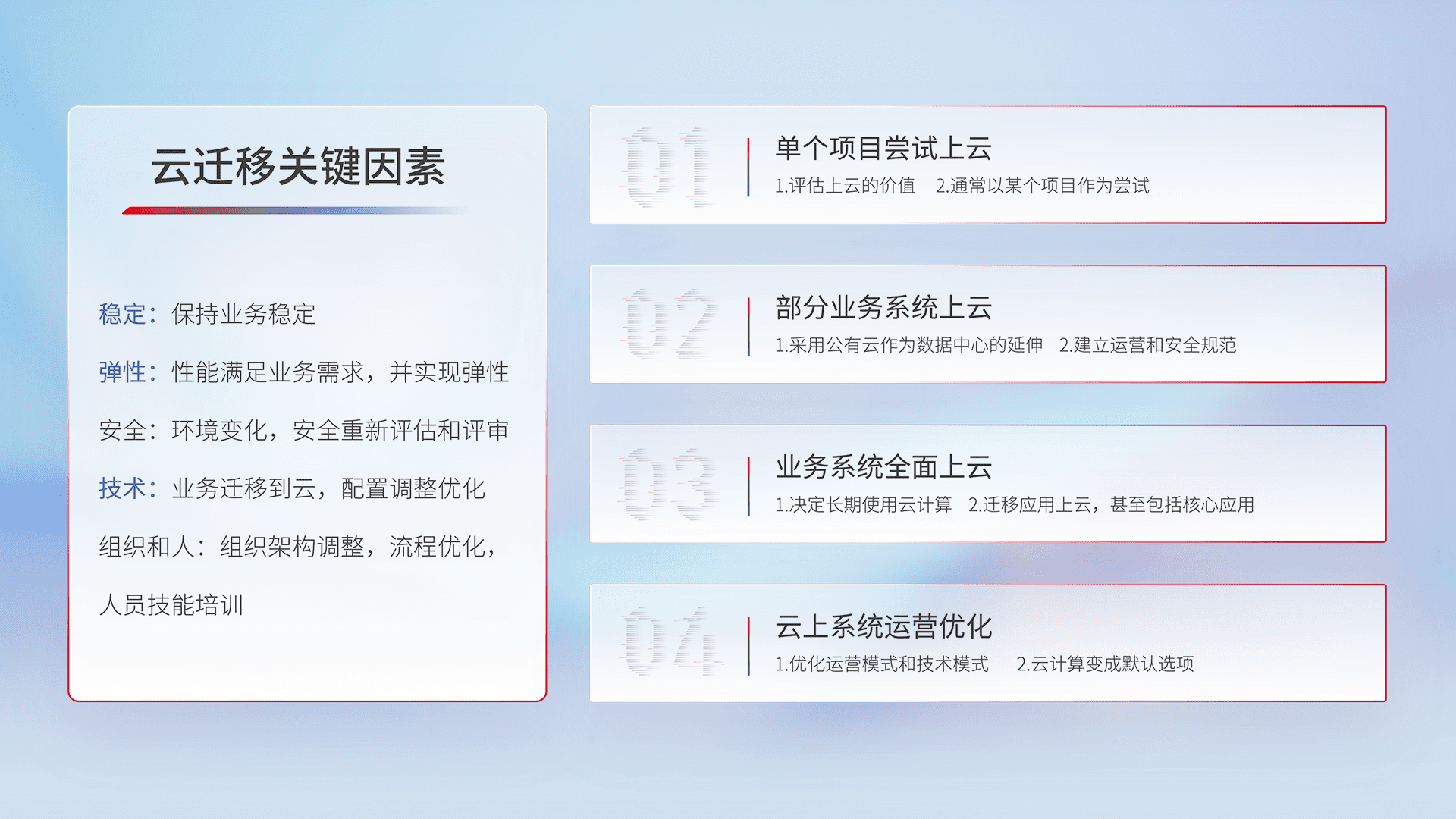 结合实际业务,,从规划设计、、云平台选型、、、、云原生改造、、、数据迁移、、、、集成交付,,迁移全过程为客户识别最佳上云路径,,,,做好风险识别管理,,,,设计网络架构、、、、身份权限、、安全审计合规、、、、操作审计、、、、日志审计、、监控告警策略、、多站点容灾设计等,,对云上基础设施进行整体规划,,,提升IT治理水平,,,,以满足弹性、、、、高可用、、、、高性能的需求。。