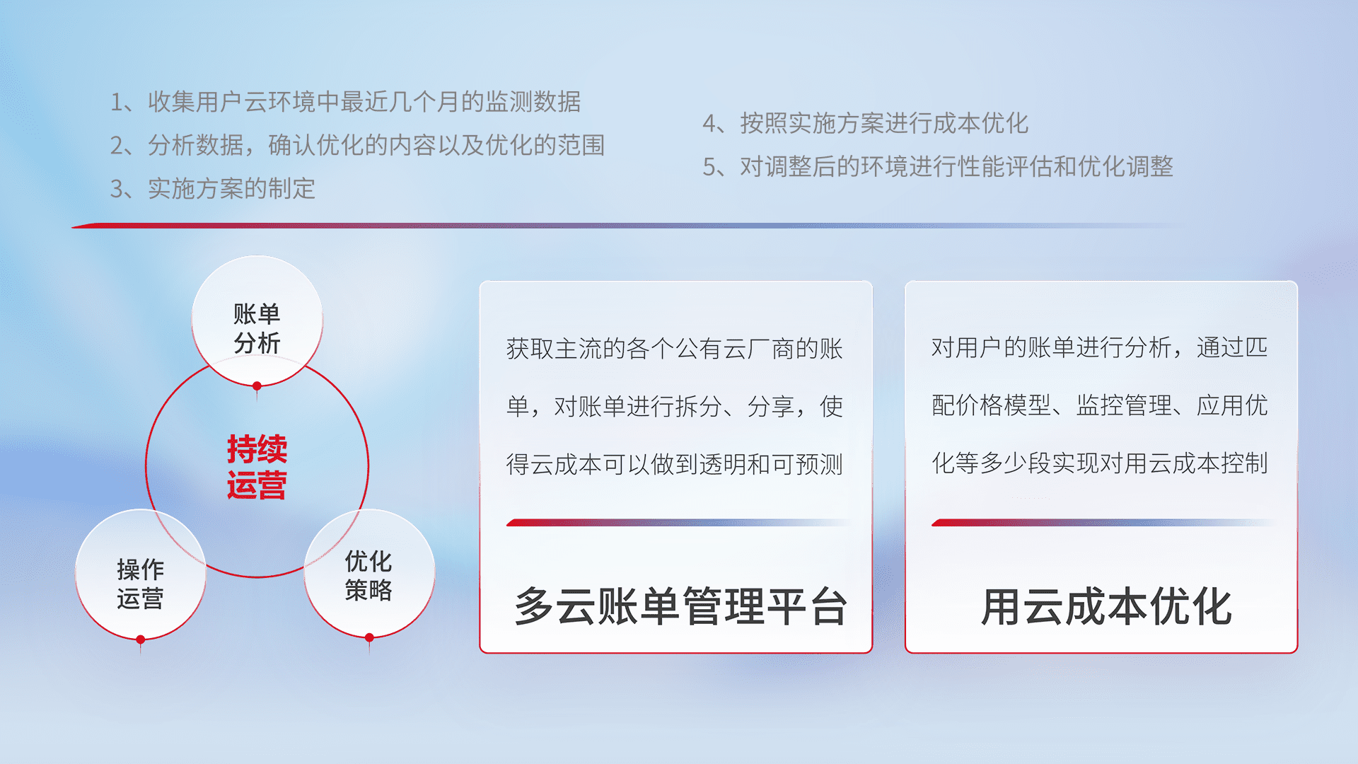 通过多云纳管,,以统一的资源数据模型把客户的云资源进行抽象和封装,,进而实现对多云资源的统一操作,,保障云资源管理的可靠性、、稳定性与可用性。。。量身定制化运维内容,,,,配置、、、开发运维、、、、补丁管理、、、、备份、、、监控、、、、认证和访问管理、、、、审计和日常巡检等,,,保障在用云过程中的可靠度,,稳定度以及高可用率。。。